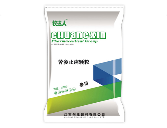 【商品名称】苦参止痢颗粒 【通用名称】0.1%水产多种维生素预混合饲料 【汉语拼音】Kusheng Zhi Li Keli 【产品组成】苦参、白芍、木香。 【性 状】本品为黄褐色至棕褐色的颗粒或粉末。 【产品特点】1、采用地道中药材,经水提醇沉技术提纯有效成份,依据中药配伍理论,科学组方而成。 2、有效成份浓度高、吸收快:经过提取后,去除了影响药物发挥的成份,使有效成分直接通过胃肠道快速吸收。 3、工艺先进:用现代中药工艺技术制成颗粒,适用性强,可饮水,可拌料,使用方便。 【功 能】清热,祛湿,止痢,泻火。 【主 治】1、用于家畜大肠湿热所致的痢疾、泻泄,证见发热腹痛、大便脓血、里急后重,细菌性痢疾等症。临床症见精神萎缩、食欲减退或废绝、呕吐、拉黄色、白色、绿色糊状稀便、水样腹泻、粪便恶臭混浊、怕冷、颤抖、行走摇摆、衰弱脱水。 2、鸡大肠杆菌病。证见精神沉郁,食欲不振或废绝,羽毛蓬乱无光泽,头颈部特别是肉垂及眼睛周围水肿,肿胀部位皮下有淡黄色或黄色水样液体,嗉囊充满食物,排淡黄色、灰白色或绿色混有血液的腥臭稀便。 【用法与用量】混饲或饮水,预防量本品500g拌料500公斤或兑水1000公斤,治疗量加倍使用,用5-7天。本品与我公司产品“肠泰欣”同时使用,效果更强。 【包装规格】1000g(500g×2包)/袋 【贮 存】密闭,防潮。