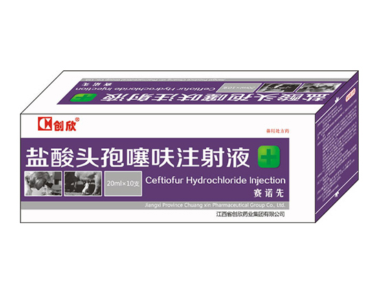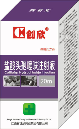【兽药名称】:盐酸头孢噻呋注射液 兽用处方药 英文名称:Ceftiofur Hydrochloride Injection 汉语拼音:Yansuan Toubaosaifu Zhusheye 【主要成分】盐酸头孢噻呋 【性 状】本品为微细颗粒的混悬液,静置后微细颗粒下沉,振摇后成均匀的乳白色混悬液。 【药理作用】药效学 头孢噻呋是头孢菌素类兽医临床抗生素,具有广谱杀菌作用,对革兰氏阳性菌和革兰氏阴性菌(包括产β-内酰胺酶菌)均有较强的抗菌作用。如多杀性巴氏杆菌、溶血性巴氏杆菌、胸膜肺炎放线杆菌、沙门氏菌、链球菌、葡萄球菌等对本品均敏感。头孢噻呋作用于转录肽酶而阻断粘肽的合成,使细菌细胞壁缺失而达到杀菌作用。 药动学 本品内服不吸收,肌内注射后吸收迅速,达峰时间约为1.8小时。本品在体内分布广泛,但不能透过血脑屏障。血中和组织中药物浓度高,有效血药浓度维持时间较长,消除缓慢,半衰期长(T1/2约为20.3小时)。在体内能生成具有活性的代谢物脱氧呋喃甲酰头孢噻呋(Desfuroylceftiofur,DFC),并进一步代谢为无活性的产物从尿和粪中排泄。 【药物相互作用】1、与氨基糖苷类联合用药有协同作用。 2、与丙磺舒合用可提高血中药物浓度和延长半衰期 【适 应 证】抗生素类药,用于治疗猪细菌性呼吸道疾病。全面预防细菌性引起的肠道和呼吸道疾病、降低环境改变、断奶应激及母源抗体减少等因素对仔猪的影响,提高成活率。 【用法与用量】肌内注射:一次量,每1kg体重,猪5mg。一日1次,连用3日。 保健使用方法:断奶或引进第1天,第7天,第14天分别肌内注射1ml/头 。 【不良反应】1、可能引起胃肠道菌群紊乱或二重感染。 2、有一定的肾毒性 3、在牛可引起特征性的脱毛和瘙痒。 【注意事项】1、使用前充分摇匀;不宜冷冻;第一次使用后需在14日内用完。 2、对肾功能不全动物应调整剂量。 3、对β-内酰胺酶类药物过敏感的人应避免接触本品,避免儿童接触。 【休 药 期】猪4日 【规 格】20ml:1g 【包 装】20ml×10支/盒 【贮 藏】遮光,密闭保存。