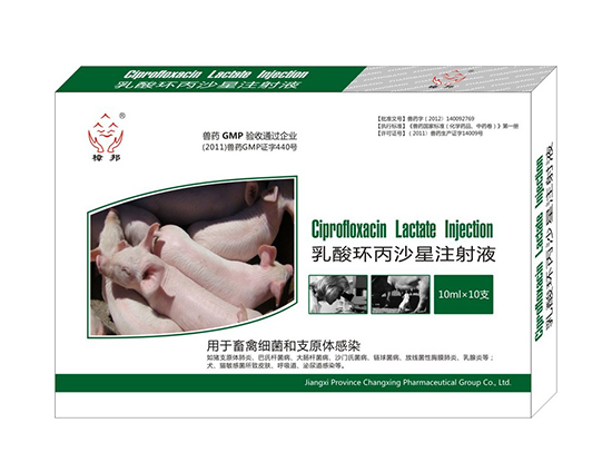Name of veterinary drug: lactate ciprofloxacin injection Veterinary prescription Ciprofloxacin Lactate Injection Chinese pinyin: Rusuan huanbingsheye [main ingredients] lactate ciprofloxacin. 【 traits 】 this product is colorless or almost colorless transparent liquid. [pharmacological action] antibiotic. This product is suitable for all kinds of infectious diseases caused by sensitive bacteria and mycoplasma. It is mainly used for chronic respiratory diseases, escherichia coli, infectious rhinitis, avian pasteuritis, avian typhoid, staphylococcus disease, piglet yellow dysentery, piglet, white pear, etc. Intramuscular absorption was rapid, and almost all tissues and fluids were distributed, and the concentration of the drug in tissues was higher than that of blood concentration. Metabolism in the liver, mainly through the kidneys. The half-life of intravenous administration is shorter than the half-life of intramuscular injection. 【 indications 】 used for livestock and poultry bacteria and mycoplasma infection, such as swine mycoplasmal pneumonia, pasteurella disease, escherichia coli disease, salmonella disease, streptococcus disease, actinomycetes pleura pneumonia, mastitis, etc; The skin, respiratory tract and urinary tract infection caused by sensitive bacteria of dogs and cats. [usage dosage] to ciprofloxacin. Intramuscular injection: one dose per 1kg, livestock 2.5 mg, poultry 5mg. Intravenous injection: livestock 2mg, twice a day, 2-3 days. [adverse reactions] 1. Degeneration of the cartilage of young animals affects bone development and causes claudication and pain. 2. The reaction of the digestive system is vomiting, loss of appetite, diarrhea, etc. 3. The skin reaction is red, itchy, urticaria and photosensitive reactions. 4. Dogs and cats can see allergic reactions, ataxia, seizures. 1. This product should be kept out of light when the light is easy to change color. 2. This product is not applicable to horses. Intramuscular injection has a sexual irritant. 3 this product does not apply to dogs of 8 weeks old. 4. There are latent excitatory effects on the central system, inducing seizures, and the dog with epilepsy. 5. Animal and kidney function of the animal is careful to use, but the occasional crystallization of urine. 6. The drug resistant strain of this product has an increasing trend and should not be used for long-term use in subtherapeutic dose. Egg-laying chicken is banned. [take the medicine period] n. 14, pig 10, poultry 28, and the abandonment period 84 hours. [specification] 10ml: ciprofloxacin 0.5g 10mlx10 / box. Storage: shade, sealed and preserved. [approval number] veterinary drug (2012) 140092769 [implementation standard] "veterinary drug national standard (chemical medicine, Chinese medicine volume)" first volume [license number] (2011) veterinary drug production certificate 14009