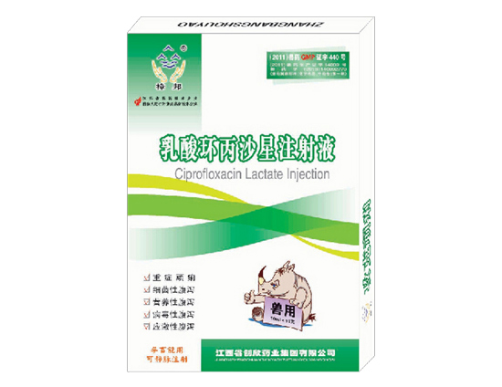Name of veterinary drug: lactate ciprofloxacin injection Ciprofloxacin Lactate Injection Chinese pinyin: Rusuan huanbingsheye (main ingredient) lactate ciprofloxacin (c17h18fn3h603)] usuan huanbingsheye 【 traits 】 this product is colorless to pale yellow transparent liquid. 【 pharmacological action 】 the antibacterial spectrum is wide, the bactericidal force is strong, the action is quick. This product is integrated into other synergistic agents and antivirals, and has obvious antibacterial effect on gram-negative and positive bacteria and mycoplasma. The mechanism of action is to antagonize the bacteria's dual-strand DNA rotatase, which blocks the replication of bacterial DNA and shows a significant effect of rapid sterilization and rapid elimination of intestinal toxins. It is an effective compound preparation for intestinal diarrhea, enteritis and abdominal distention caused by many pathogenic bacteria and viruses. Antagonism to the use of children 8FN3O3. C3H603. [indications] severe disease: severe diarrhea, diarrhea, diarrhea, diarrhea, diarrhea, diarrhea, diarrhea, diarrhea, diarrhea and diarrhea. Bacterial diarrhea: such as piglet, yellow and white dysentery, paratyphoid fever, calf diarrhea, avian cholera, and pullorosis. Nutritional diarrhea: such as overnutrition or not benign diarrhea. Viral diarrhea: infectious gastroenteritis, fluid diarrhea, rotavirus, etc. Irritable diarrhoea: weaning, refueling, rotation, weather change, environmental discomfort, external purchase of pigs and other stress-related diarrhea. 【 dosage 】 internal medicine: Suckling pig is the best medicine for internal medicine. Intramuscular or intravenous injection: one dose per 10kg horse, 0.3ml (0.03 ml/kg), sheep, 0.5ml (0.05 ml/kg), dogs, cats, and poultry 0.5 to 0.7ml(0.05 to 0.07 ml/kg), 1 time a day, and one injection after 24 hours. Special note: severe cases of severe cases: can be in the pig tail to give the nest (between the tail vertebra and anus) inject effect is good, can have the effect of quick effect quickly. [adverse reaction] few animals have vomited reaction, stop medicine hind oneself disappear. [note] 1. When injecting intravenous, dilute with saline or glucose injection. 2. The concentration of this product is high. If the product is crystallized by cold precipitation, it will be cooled to the temperature after the temperature is dissolved. [the drug period] 28. [specification] 10ml: ciprofloxacin 1g Packaging: 10ml x 10 / box Storage: shade, sealed and preserved.