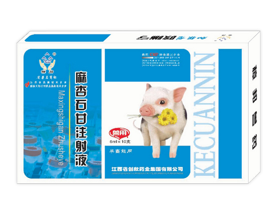 Name of veterinary drug: ginkgo injection English name: Injection Chinese pinyin: Maxingshigan Zhusheye 【 main ingredients 】 2 %, 1% of bitter almonds, 1% of gypsum, 1% of licorice, and 15% of kanamycin sulfate. 【 traits 】 this product is yellow transparent liquid. [pharmacological action] broad-spectrum antibacterial drugs. Its mechanism is on the 50 s of bacteria RNA subunits, turn by blocking peptide mRNA and displacement and resist bacterial protein synthesis, the mycoplasma effectively, to golden brown staphylococcus, streptococcus, streptococcus pneumoniae, fester suppuration and other sensitive corynebacteria. It is especially sensitive to mycoplasma, which is the most powerful drug for the anti-mycoplasma in macrocyclic lactone. It has good effect on helicobacter, bacillus, recluse and chlamydia. This product is suitable for the essence of antivirals, especially for circovirus, blue ear virus, pseudo rabies virus infection and latent infection, which has a significant effect on the infection of virus and bacteria. The intramuscular injection absorbs quickly, the tissue penetrability is strong, the biological utilization rate is high, the effect is fast, the effective antibacterial concentration is long, and the excretion is quick after stopping. [indication] 1. Streptococcus disease, pant disease, infectious laryngotracheitis, chronic respiratory disease, mycoplasma abscess septicemia, sinus inflammation, mycoplasma pneumonia, infectious arthritis, atrophic rhinitis infectious disease caused by high fever, difficulty breathing, pneumonia, tracheitis, bronchitis. 2. Diseases such as acute and chronic respiratory diseases caused by virus and bacterial cross infection. Such as pneumonia, mycoplasma pneumonia, asthma, typhoid, cold, etc. 3. For reproductive and respiratory syndrome (blue ear disease) circovirus disease, pseudo rabies virus infection and secondary respiratory disease, respiratory syndrome. The animals are characterized by depression, loss of appetite or hunger, high fever, red body, purple, jaundice, difficulty breathing, breathing and coughing. Mother and animal abortion, stillbirth, some animals cause pleural pneumonia and so on. Use this product to have good effect. 4. Pasteulosis caused by pneumonia, heat of transport and the disease caused by pyogenic actinomycetes; Dysentery caused by the treponema of swine dysentery. 5. Unexplained respiratory diseases. [usage] Intramuscular injection: a quantity per 1 kg pig weight 0.05 ~ 0.08 ml cattle, sheep 0.12 ml 0.1 ml birds usually can be cured at a time A laparoscope, usually connected to a severe 2 ~ 3 days, three days before and after weaning piglets, disease, serious when per kilogram of muscle note 0.05 ~ 0.1 ml Inner garment: 10ml water 10kg for free drinking, 2 ~ 3 days [adverse reactions] I saw a rash reaction and disappeared after stopping the drug. [note] 1. If the product is crystallized in cold precipitation, it will be cooled to the temperature using hot water temperature, without affecting the curative effect. 2. The water solution of this product can be reduced by iron, copper, aluminum and tin plasma. Stop medicine for 14 days before slaughter. [specification] 10ml: equivalent to 20g of original medicine 10mlx10 / box. Storage: sealed in cool dark place.