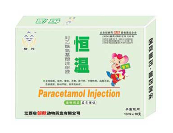 Name of veterinary drug: acetaminophen injection English: Paracetamol Injection Chinese pinyin: Duiyixian 'anjifen Zhusheye [main components] 5% of acetaminophen, 5% of dichlorophenol and 20 %. 【 traits 】 this product is colorless or almost colorless and slightly sticky. Pharmacological action: antipyretic analgesic. By inhibiting the synthesis and release of prostaglandins, the normal temperature of the body is returned to normal temperature by the central regulation. This product can also selectively act on the body temperature regulating center, reduce its abnormal excitability, and make the skin blood vessels dilation through the neuromodulation, the perspiration enhancement, the respiration acceleration and other ways to increase the heat dissipation. At the same time, it can prevent the generation and release of the leukocyte heat source by stabilizing the lysosomal body of the leukocyte, so that the temperature regulation center is stimulated by the heat source, and the body temperature is restored to normal level. [indication] 1. The various ages of swine fever, high fever, jaundice, and non-food, etc., caused by various viruses, such as pig disease, swine erysipelas, parvovirus, blue-ear disease, circovirus, pseudo rabies, etc. 2. The disease of piglets, streptococcus, red cytopenia and toxoplasmosis causes high fever, loss of appetite, and the condition of lying down. 3. Malaemia, infectious anemia, rinderpest, epidemic fever, and other calorific diseases. 4. Fever of canine distemper, canine parvovirus infection, rabbit distemper and virus hemorrhage of fox, mink and special animal, etc. [usage dosage] intramuscular injection: at one time, every 1kg weight horse, 0.05ml of cattle, 0.1ml of pig, sheep, 0.2ml of dog, and 2 days. The severe day can be injected twice. [adverse reactions]. There are few adverse reactions to the amount of treatment, such as cyanosis, anorexia, nausea and vomiting. 1. The cat is banned. 2. Patients with liver and kidney insufficiency of animals and young animals should be used with caution. There is no regulation. [specification] 10ml: 1g Packaging: 10ml x 10 / box Storage: shade, sealed and preserved.