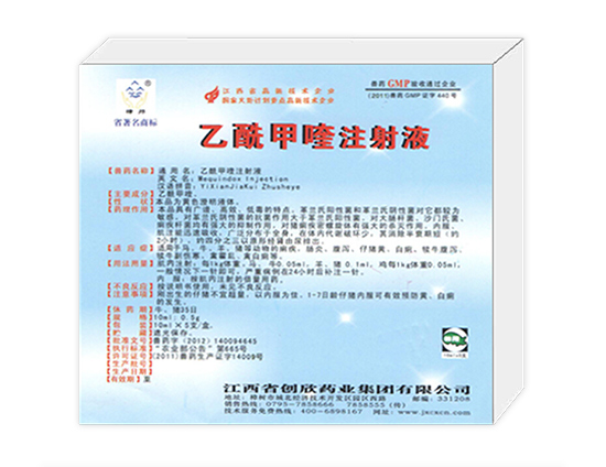 Acetylmethaquine injection Generic name: acetylmethaquine injection for veterinary medicine English name: Mequindox Injection Chinese pinyin: Yixianjiakui Zhusheye Main ingredient: acetylmethaquine. 【 traits 】 this product is yellow transparent liquid. [pharmacological action] broad spectrum antibiotic. The effect of gram negative bacteria is stronger than gram positive bacteria, and also has a strong effect on the treponema. Its antibacterial mechanism is to inhibit the synthesis of DNA. Intramuscular injection is well absorbed, widely distributed and eliminated rapidly. Used for intestinal infection caused by diarrhea and enteritis. [usage and dosage] intramuscular injection: at one time, livestock are weighed per kg, pig 2 ~ 5mg. [adverse reactions] the quality of the treatment is not harmful to chickens and pigs. When usage is 3 to 5 times more than the clinical treatment, or prolonged use can cause toxic reactions, or even death, poultry is more sensitive. There is no provision for this. [rest of medicine period] cattle, pig 35 [specification] 10ml: 0.5g Packaging: 10ml x 5 branches/box. Storage: storage. [approval number] veterinary drug (2012) 140094645 [executive standard] the first volume of veterinary drug national standard (chemicals, Chinese medicine volume) [license number] (2011) veterinary drug production certificate 14009