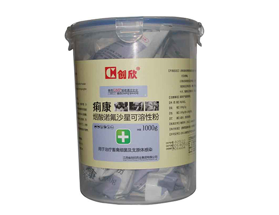 Name of veterinary drug: soluble powder of noofloxacin nicotinic acid English name: Norfloxacin Nicotinic Soluble Powder Chinese pinyin: Yansuan nuofushli Kerongxingfen [main ingredient] nofloxacin nicotinic acid 【 traits 】 this product is white or light yellow crystalline powder. [pharmacological action] antibiotic. The effects of gram-negative bacteria such as pseudomonas aeruginosa, escherichia coli, salmonella, klebsiella pneumoniae and hydrophilic monocytopenia were found to be effective. Its action mechanism is to inhibit the synthesis of deoxyribonucleic acid by the DNA of antagonistic body and inhibit the synthesis of deoxyribonucleic acid. This product absorbs quickly, the body distributes widely, the bioavailability is high. It is mainly converted into N- to ethyl metabolites and oxidized metabolites, mainly excreted in the urine by the kidneys. Antibacterial drugs. Used to treat bacterial and mycoplasma infection of livestock and poultry. [usage dosage] : chicken, prevention, every 1L of water 4g, for 3-5 days; Treatment, 20g per 1L of water, 1 time per day, 3 ~ 5 days. [adverse reactions] 1. Degeneration of the cartilage of young animals affects bone development and causes claudication and pain. 2. The reaction of the digestive system is vomiting, loss of appetite, diarrhea, etc. 3 skin reactions include erythema, pruritus, urticaria, and photosensitive reactions. 4. Dogs and cats can see allergic reactions, ataxia, seizures, etc. 【 caution 】 egg chicken egg production period is disabled. The chicken is on the 28th. [specification] 100g:5g [packaging] 100g/bag Storage: shade, sealed and preserved. [approval number] veterinary drug (2012) 140092178 [implementation standard] "veterinary drug national standard (chemical medicine, Chinese medicine volume)" first volume [license number] (2011) veterinary drug production certificate 14009