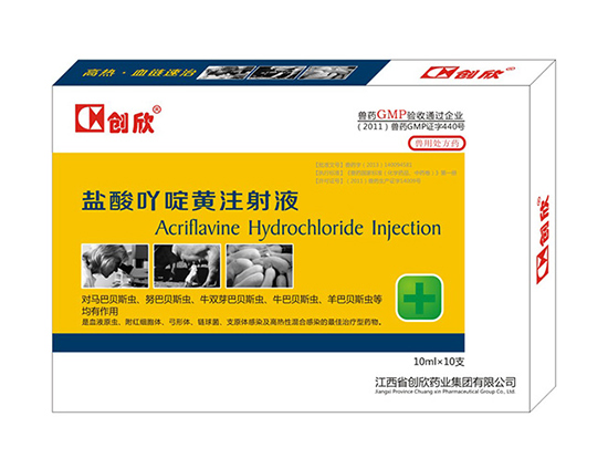 Generic name: acridine hydrochloride injection Injectio Acriflavini Hydrochloridi Chinese pinyin: Yansuan Adinghuang Zhusheye Ingredient: acridine hydrochloride. 【 sex 】 this product is orange red clear liquid. [pharmacological action] acridine yellow is effective for the mambas, the rocbuba, the bovine bisphorus, the bovine babasus, the sheep Barbados, etc., but it is not effective for the Taylor worm and the slurry. After 12 ~ 24 hours of static injection, the body temperature drops and the insect body disappears in peripheral blood circulation. In addition, gram-positive bacteria also have a strong antimicrobial effect, which can be used to develop trauma, uterus and vagina. Applied to pear - shaped insect disease. [usage and dosage] frequently used intravenous injection: one dose per 1kg weight, horse, cattle 3 ~ 4mg; Sheep and pigs 3mg. Extreme intravenous injection: one dose, horse, cattle 2g, sheep, pig 0.5 g. [adverse reactions] 1. The toxicity is strong, and the heart rate of the heart rate increases after injection. 2. Strong irritation to the organization. 【 caution 】 inject slowly, do not leak blood vessels; Repeated use should be between 24 and 48 hours. [the drug period] 28 [gage] 10ml:50mg Package: 10ml/branch [storage] sunshade, sealed, preserved in the shade.